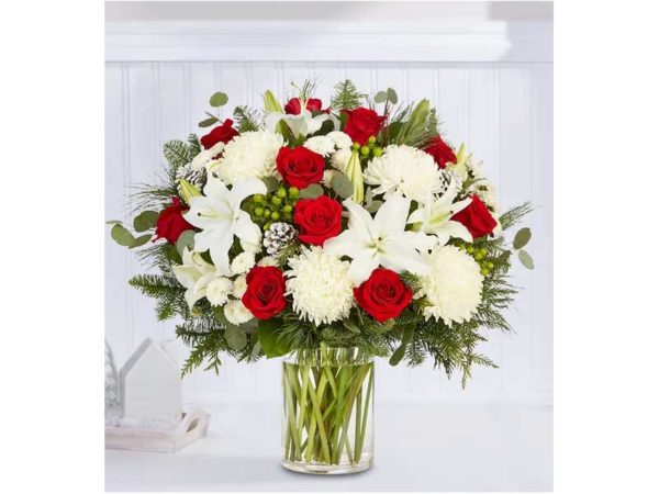 • All-around arrangement with red roses, white Oriental lilies, football mums and button poms, green hypericum; accented with silver dollar eucalyptus, assorted Christmas greens and glittered pinecones
